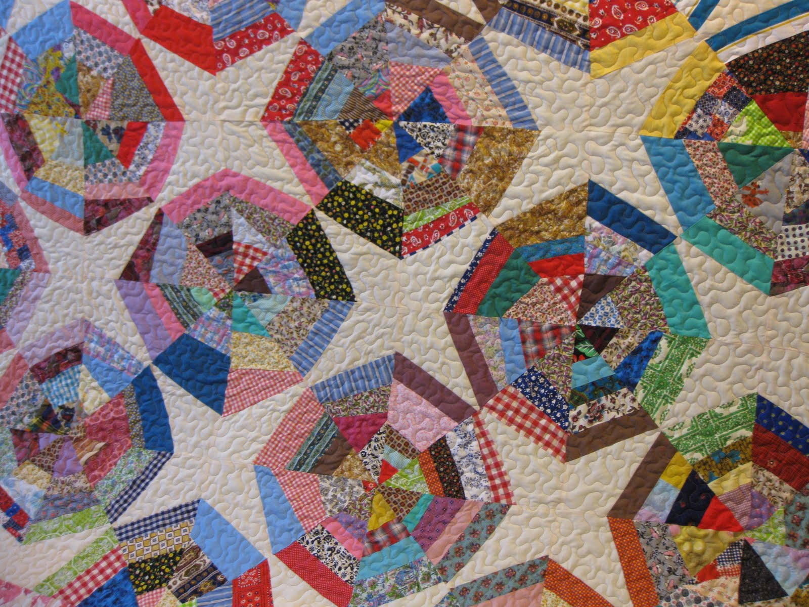 Scrappy backing with a solid red quilting thread.